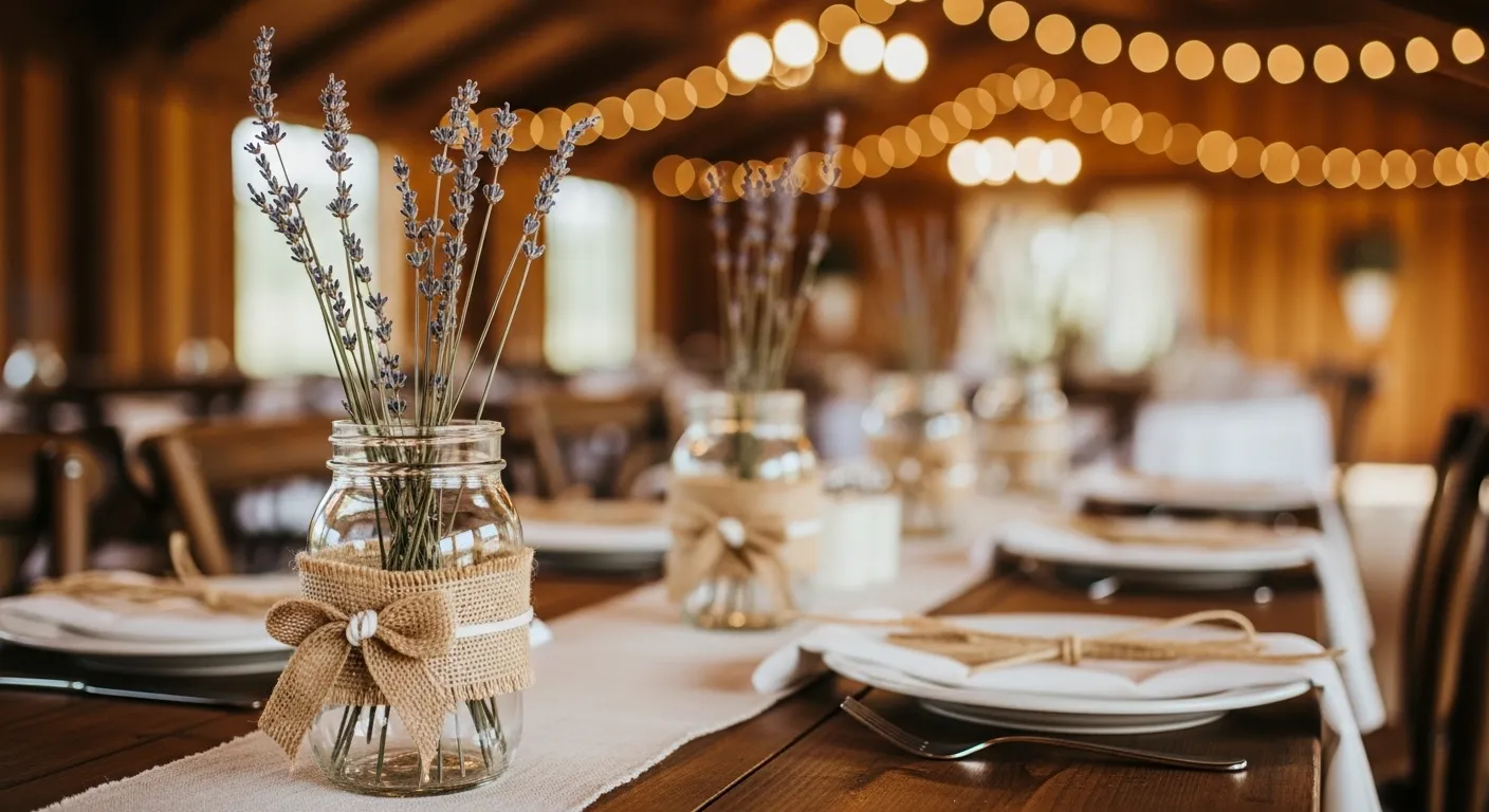 Burlap adds texture and rustic charm. It pairs well with wood tables and wildflowers.