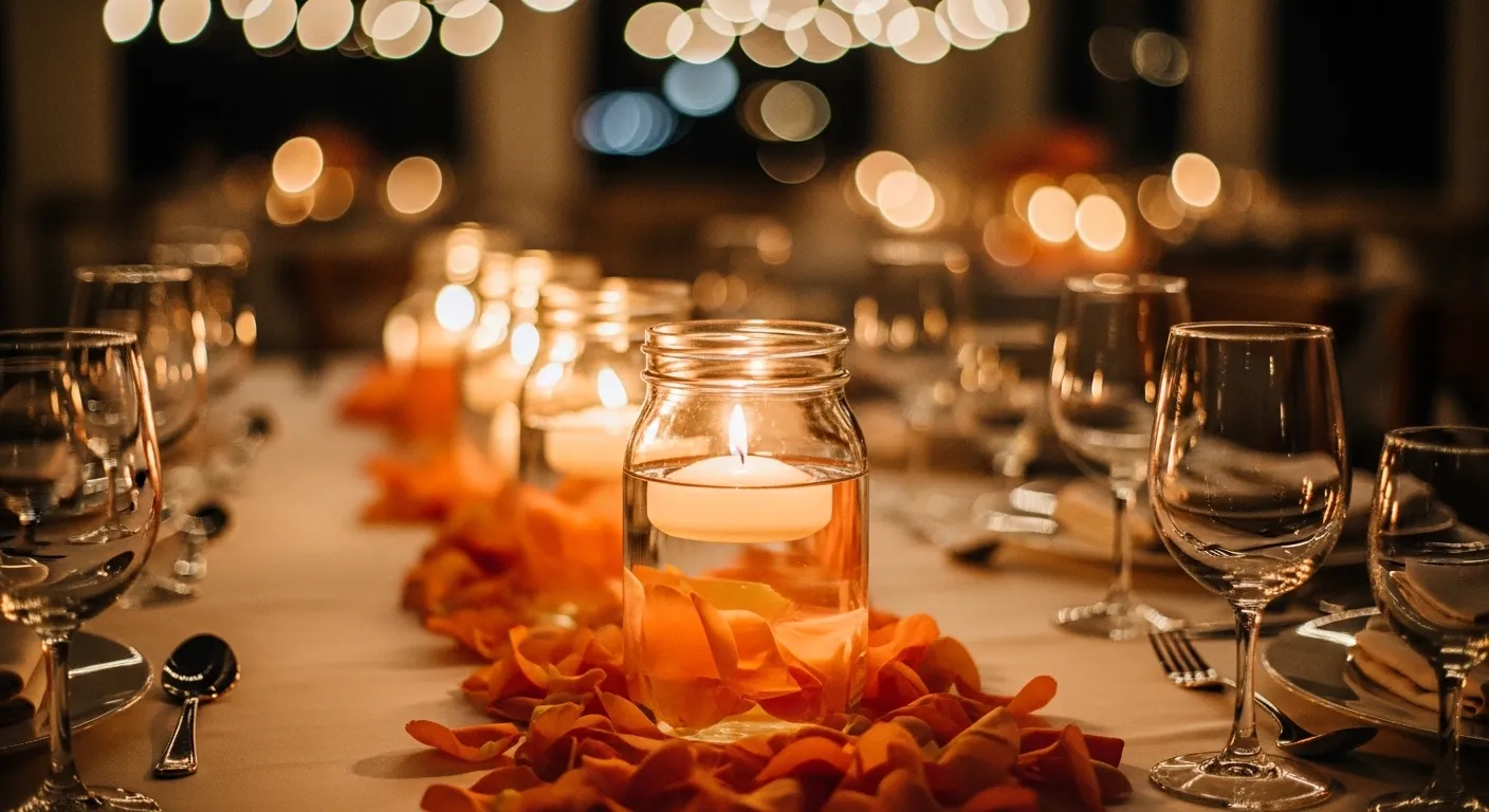 Water and floating candles feel surprisingly elegant. They create soft reflections and a warm glow across the table. Before placing floating candles inside jars, it helps to review these candle safety guidelines for home and events so your centerpieces glow beautifully while staying safe all evening. Add petals or lemon slices for a styled look. This setup looks expensive, but it costs very little.