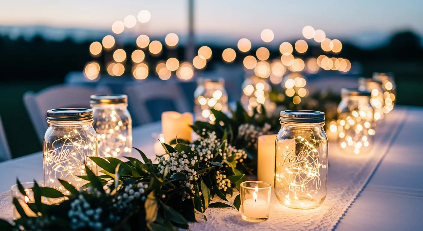 Tiny warm lights inside jars create cozy sparkle after sunset. They glow softly without harsh brightness, which makes dinner photos look dreamy and romantic.