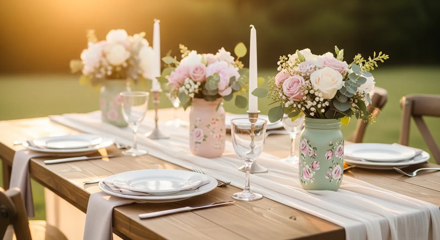 Soft hand-painted flowers instantly make plain jars feel custom. Use muted tones like blush, sage, cream, or dusty blue. Even simple brushstrokes look charming and handmade, adding warmth to farmhouse or outdoor weddings.