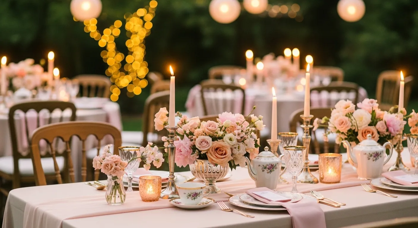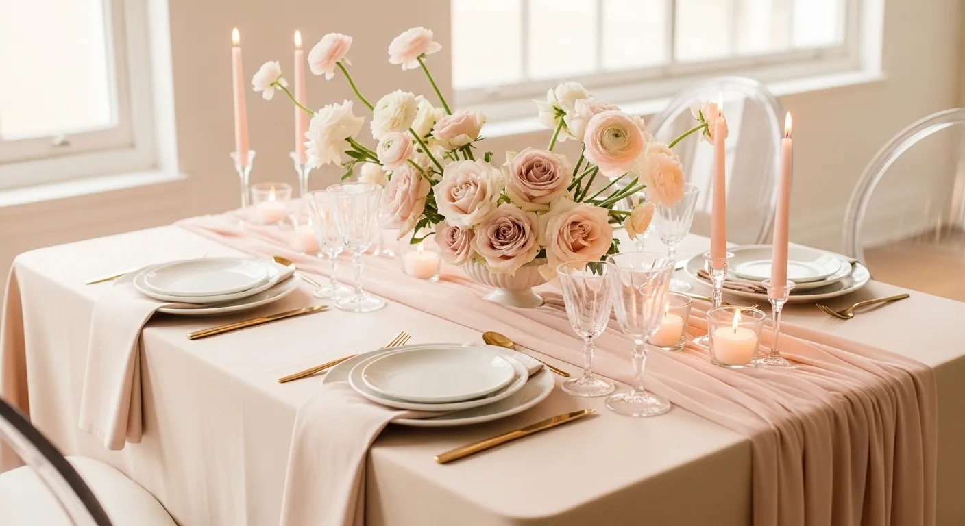 Blush pink sets the tone for the whole room. It feels warm but still light. Start with one main pink layer, then add soft neutrals so the table doesn’t look too sweet. Keep finishes matte or satin for a clean look.