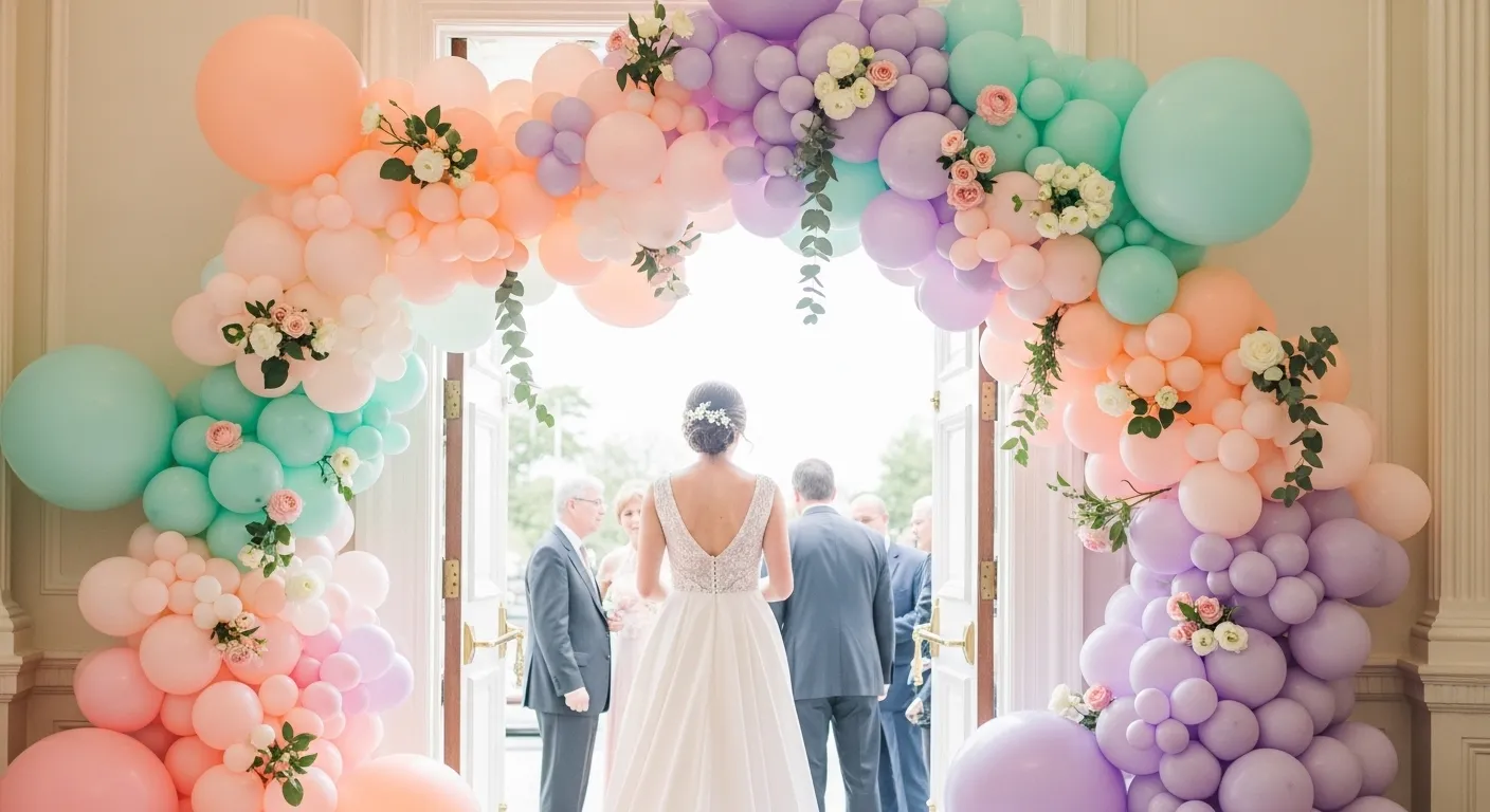 Balloon clouds are fun but still chic if colors stay soft. Mix matte pastels only. Great for photo areas or entrances.