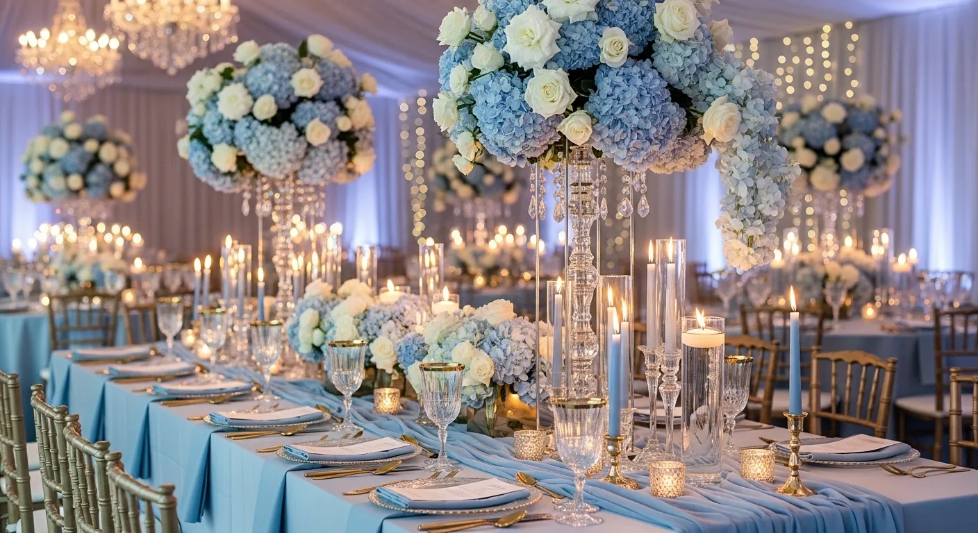 Powder blue cools the palette and balances pink and peach. Use it as a base layer, not the star. Light blues help white decor pop.