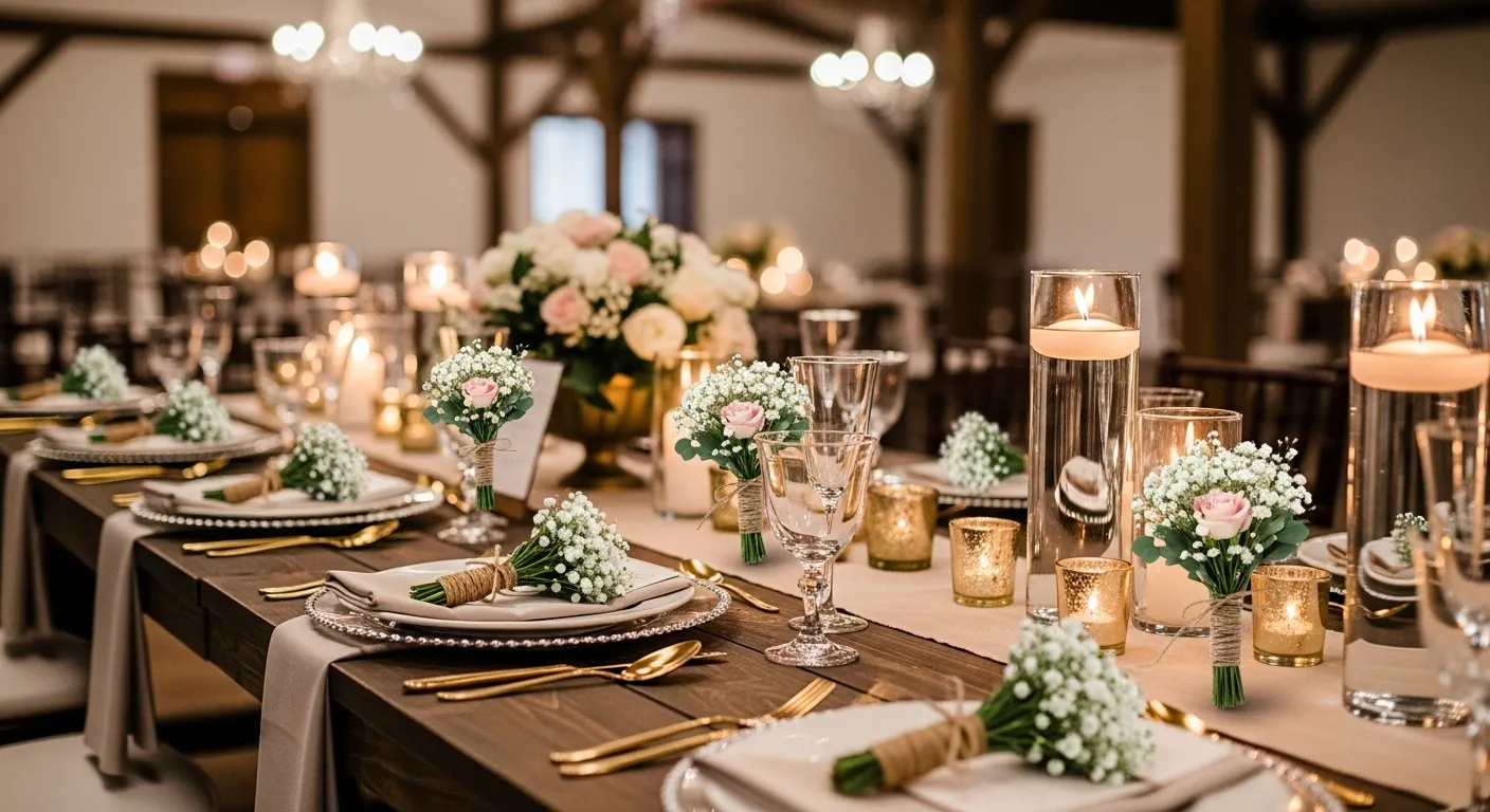 Instead of one big arrangement, place mini bouquets across the table. Each bundle feels handmade. Guests can even take one home later. It’s simple but feels thoughtful and personal.