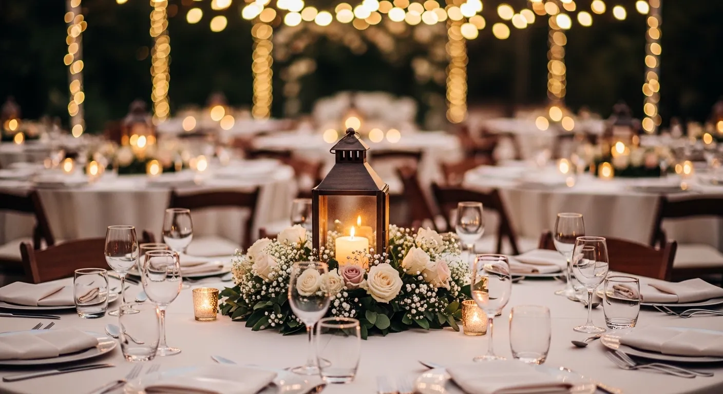Lanterns add height and glow without needing flowers. Mix small and tall pieces so the light spreads evenly. At night, the flicker creates a cozy, storybook vibe that photos love.