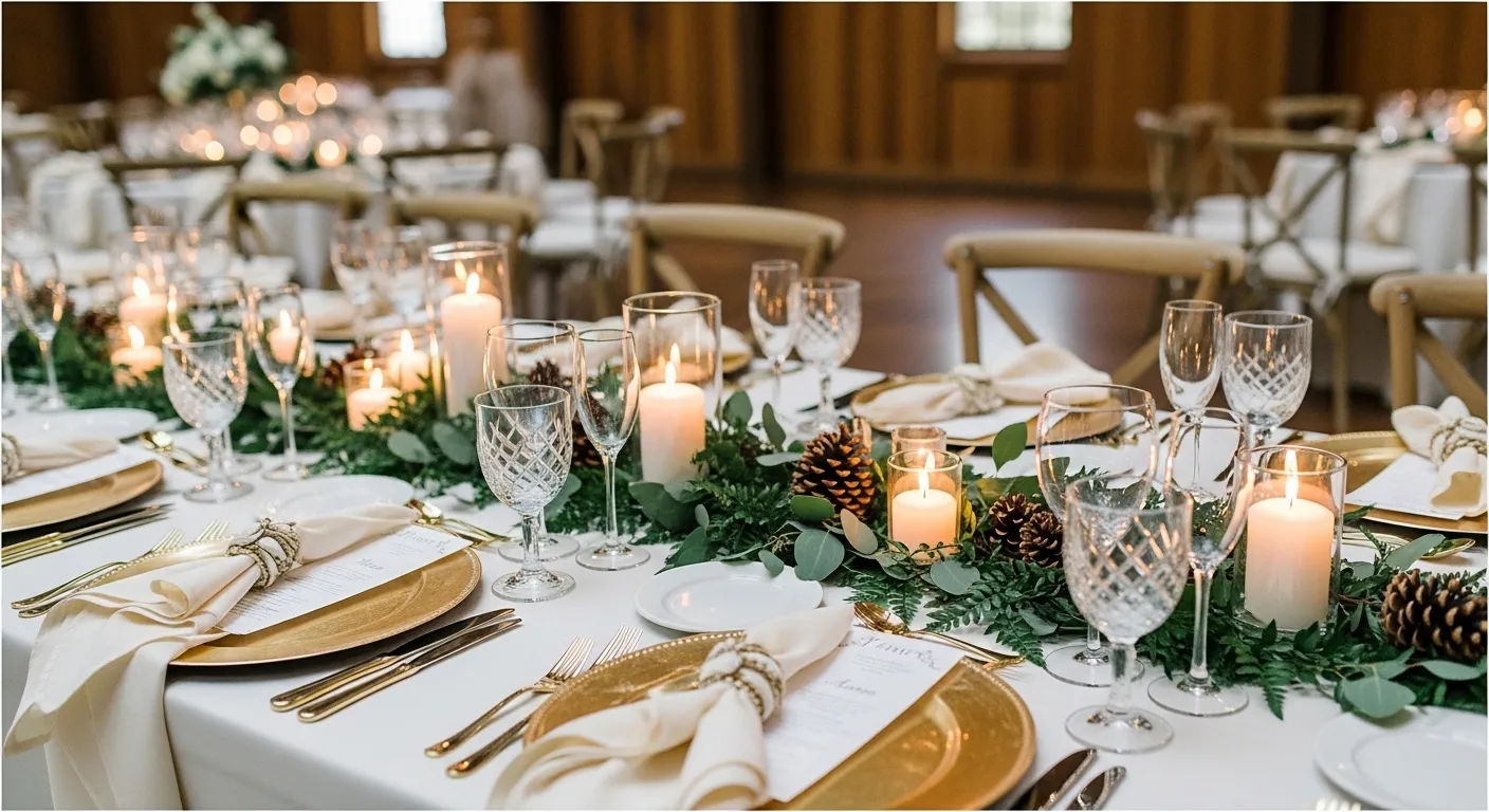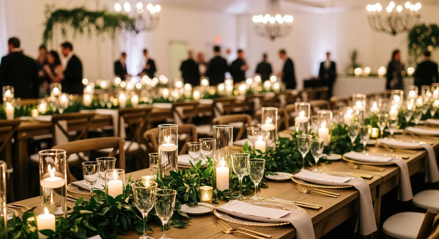 Long tables feel communal and warm. Use a continuous greenery runner with candles spaced evenly. It looks full but still easy to talk across.