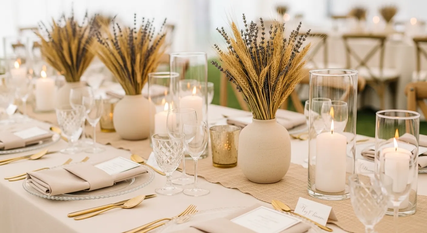 Wheat adds height and shape. Lavender adds color and scent. Together they feel countryside and timeless. Dried stems also last all day without water.