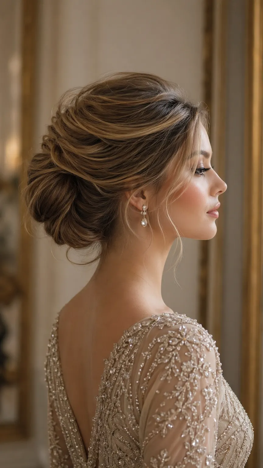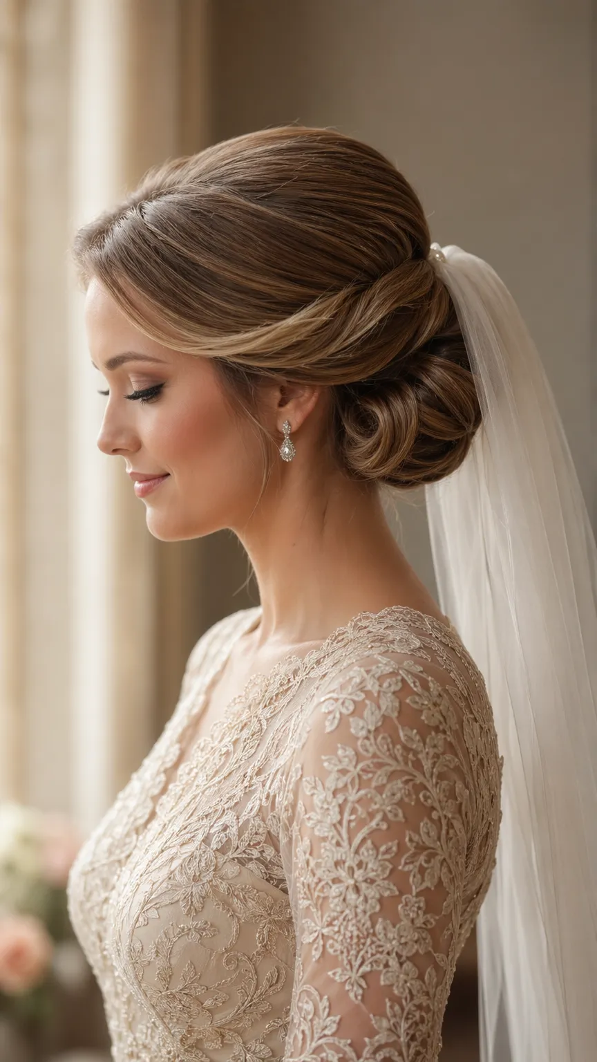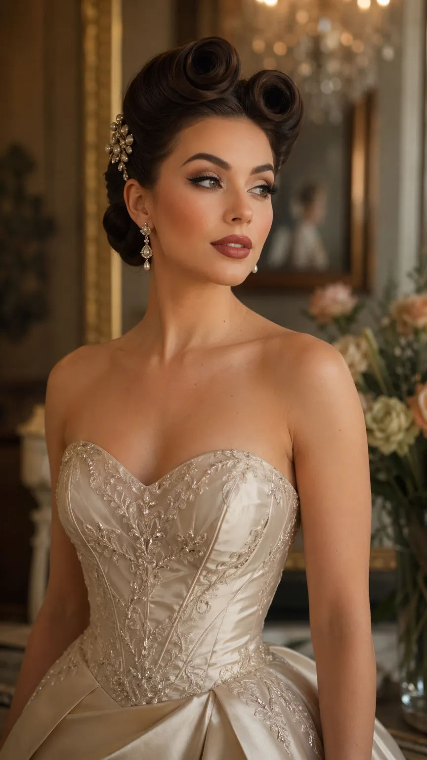 Structured updos give vintage bridal hair a very timeless kind of elegance. A low chignon with a sculpted front, a tucked roll at the nape, or a softly lifted crown can all create that refined retro feel without looking too formal. These styles are especially lovely when the neckline or earrings deserve more space to show.