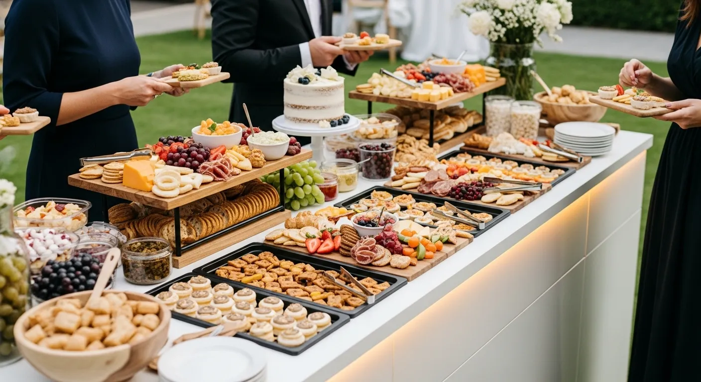 Instead of one cake alone, build a full sweets display. Guests love variety and it reduces cake-cutting stress.