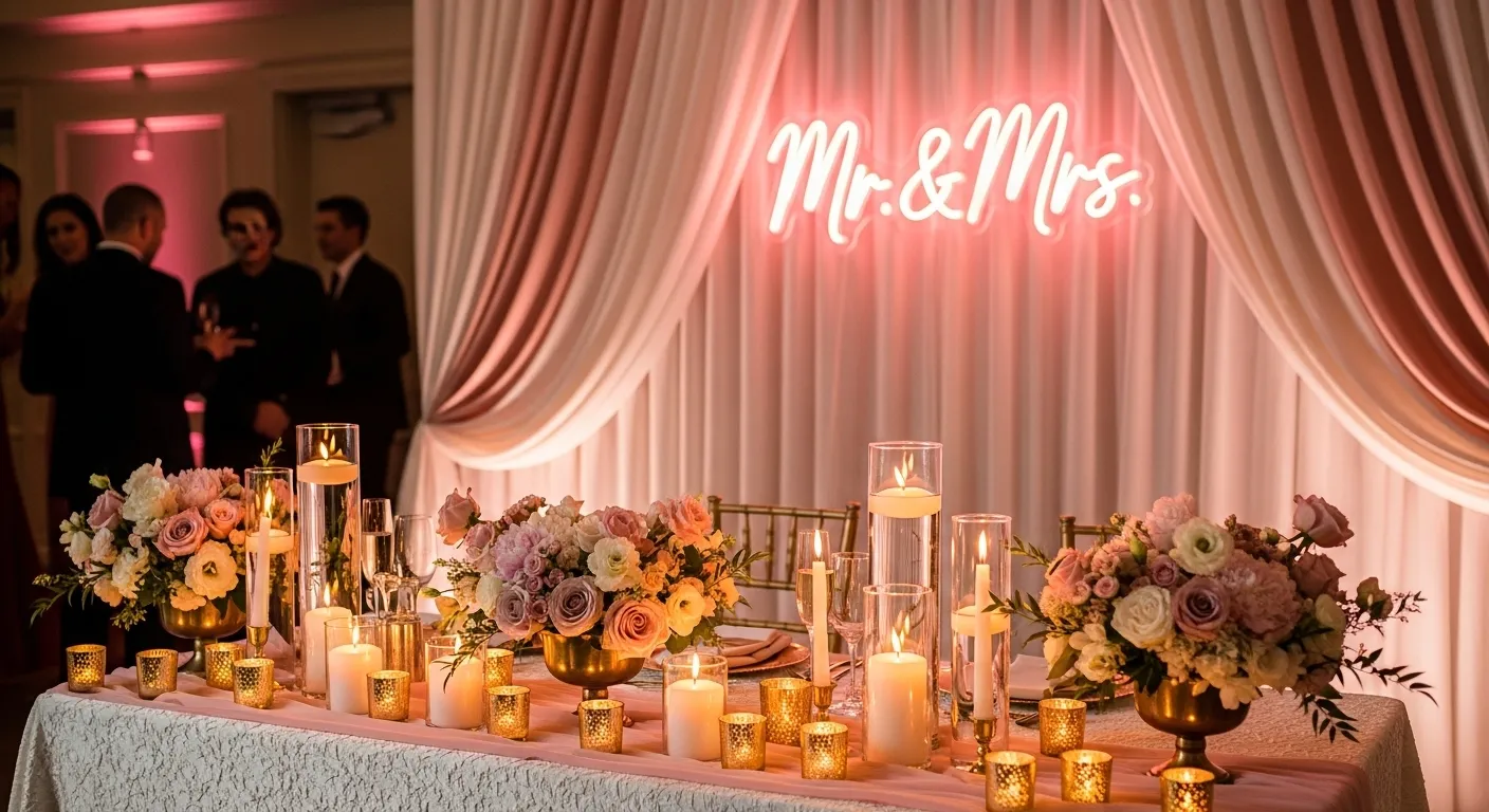 A neon quote or your name becomes an instant photo spot. Guests naturally gather there for pictures, which helps your layout feel alive.