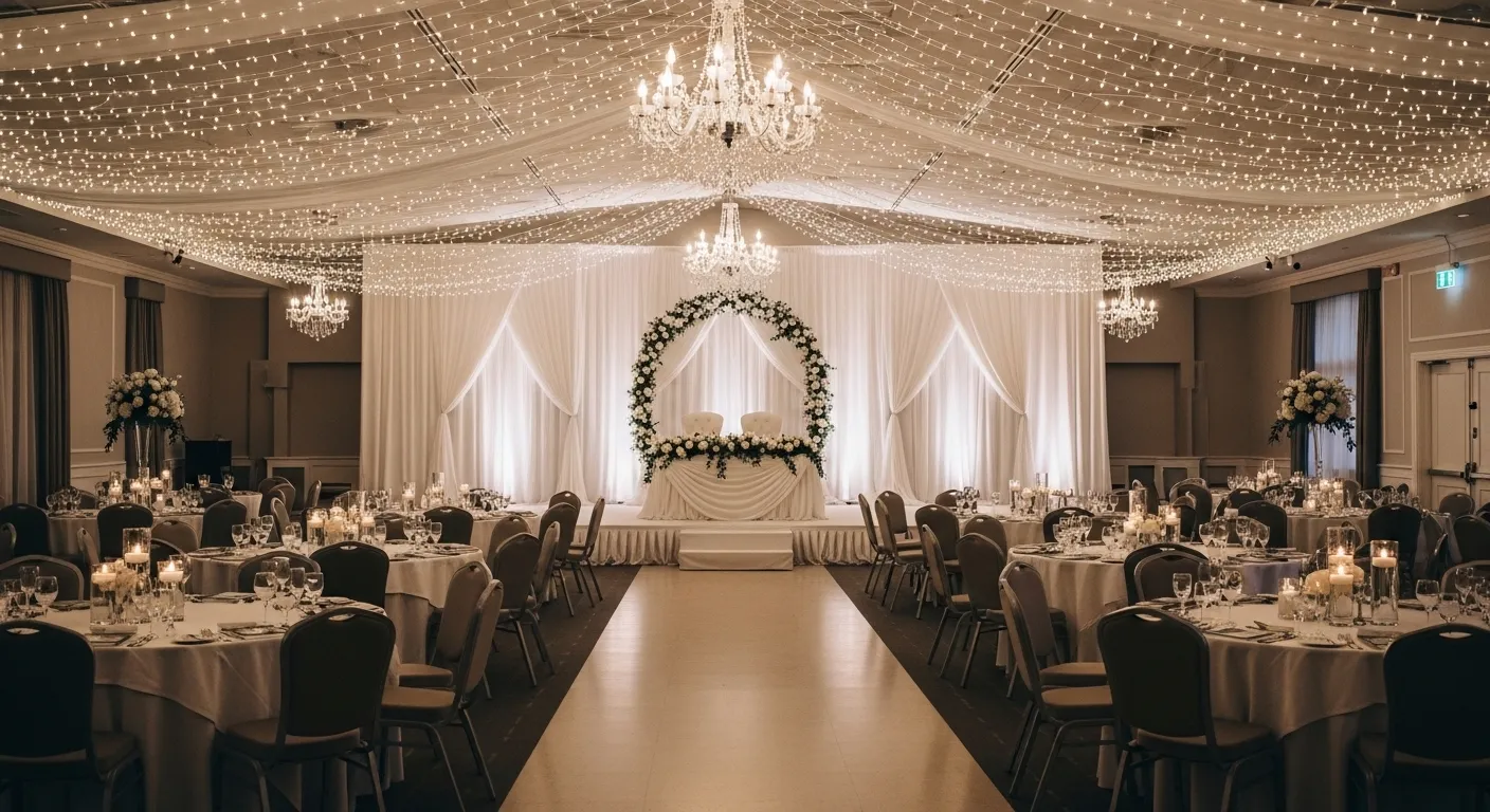 A ceiling full of twinkle lights instantly turns a plain hall into a dreamy sky. Guests look up and smile. Photos looku7 magical. It hides ugly ceilings and adds depth without heavy decor. Perfect if your venue feels empty or industrial.